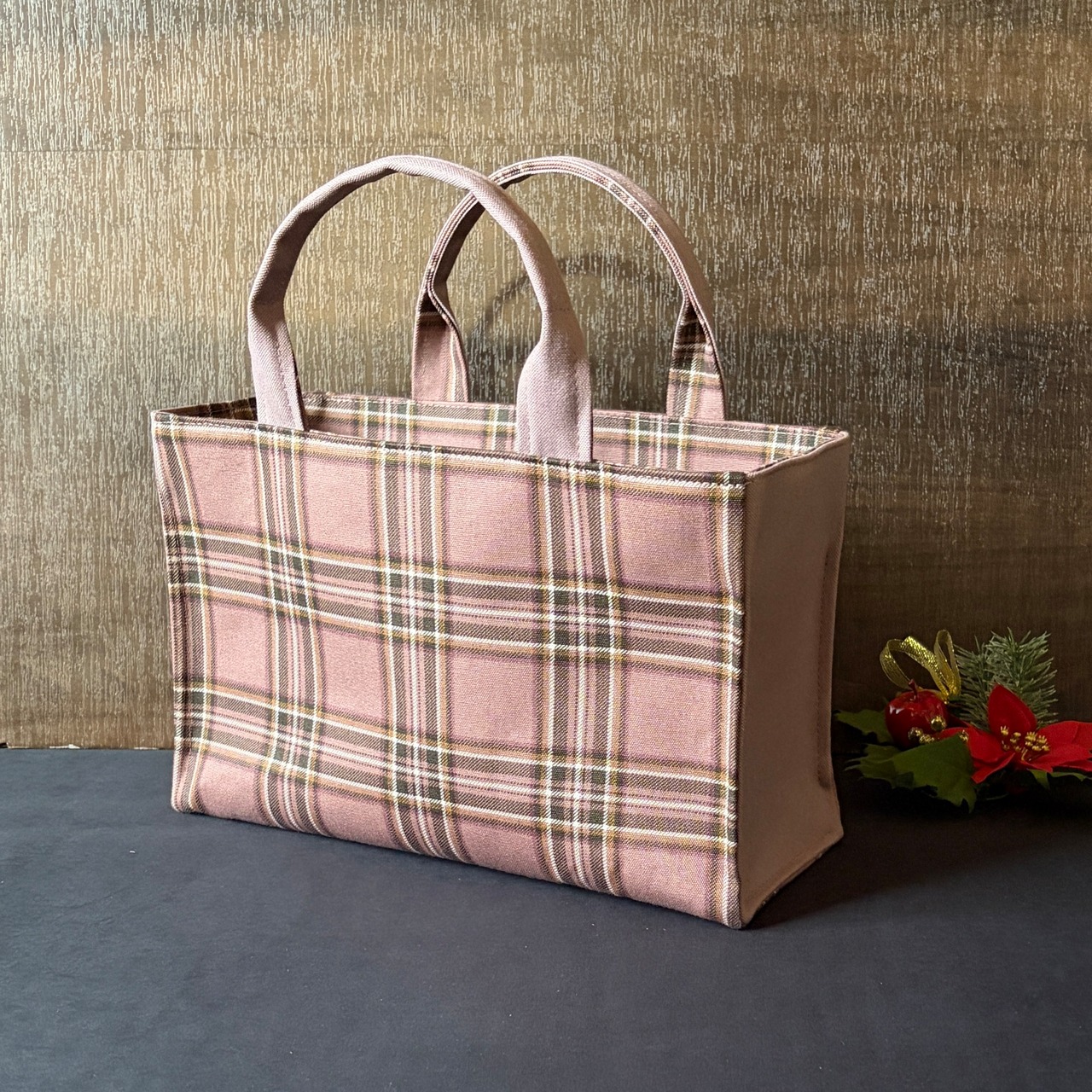 タータンチェック柄の生地と、サイドのマチ・持ち手に11号帆布を組み合わせた